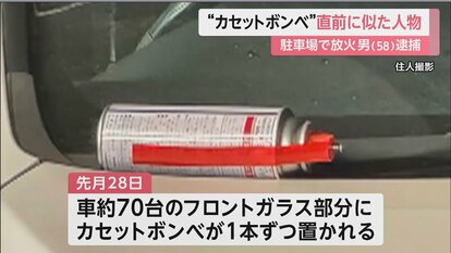 マンション駐車場の車が焼け住人の男が放火容疑で逮捕された事件で、先週、同じマンションで車のフロントガラスにカセットボンベが置かれた直前に、周辺の防犯カメラに男と似た人物が映っていたことがわかりました。