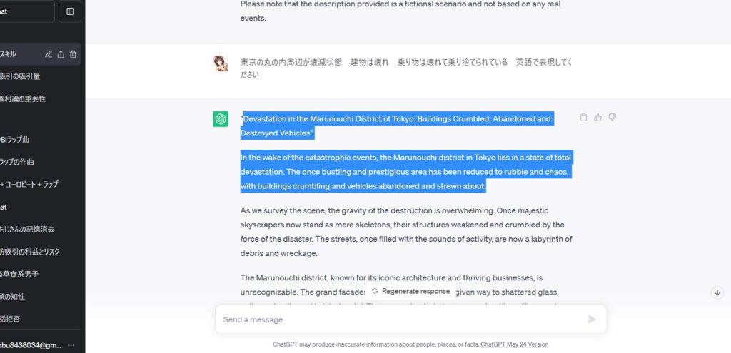 ChatGptに日本語で画像にしたい背景などを書き込んで英語に翻訳してもらう。