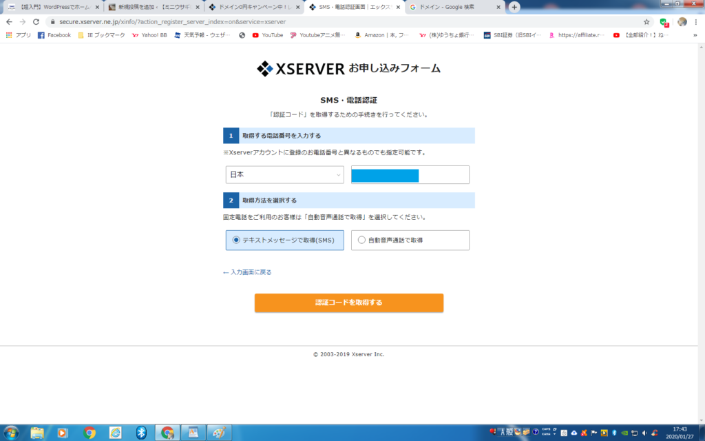 ⑦認証コードを取得したら、コードを入力