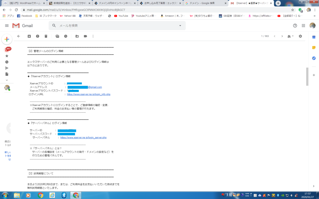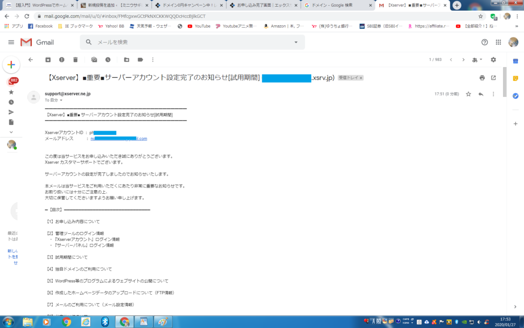 ⑨エックスサーバーに登録したメールアドレスにメールが届きます。