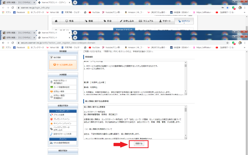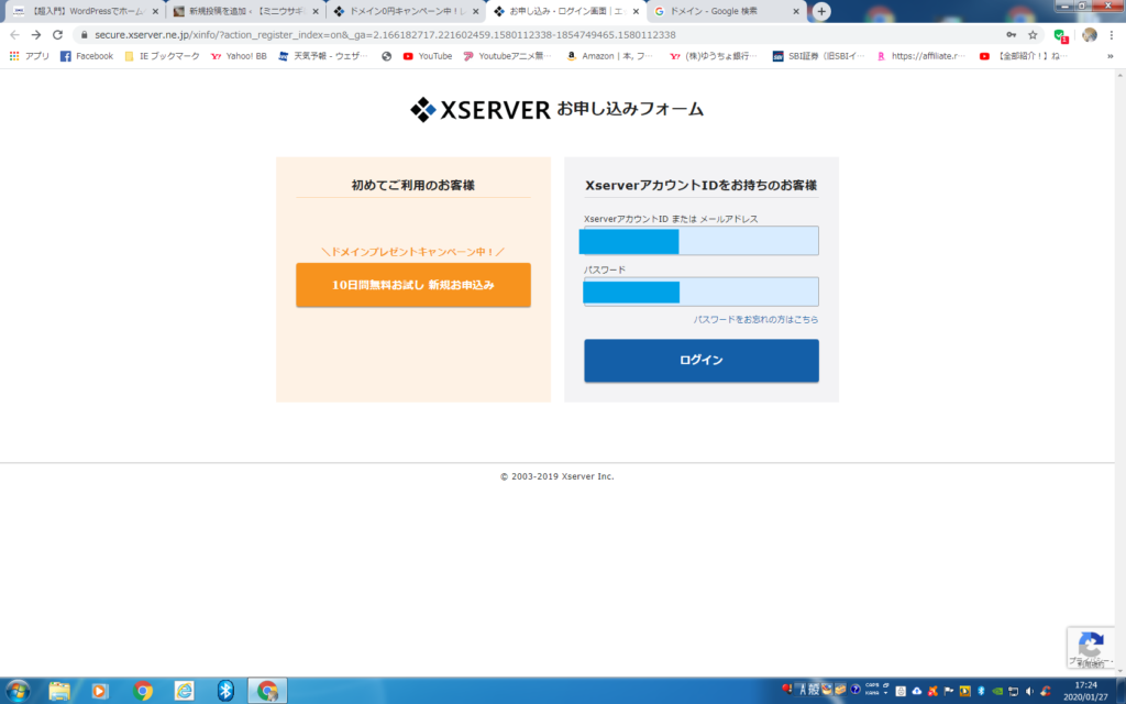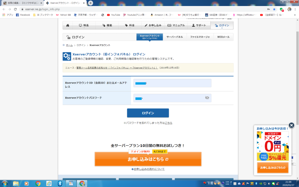 ①まず最初にエックスサーバーを開いてログインをする。
