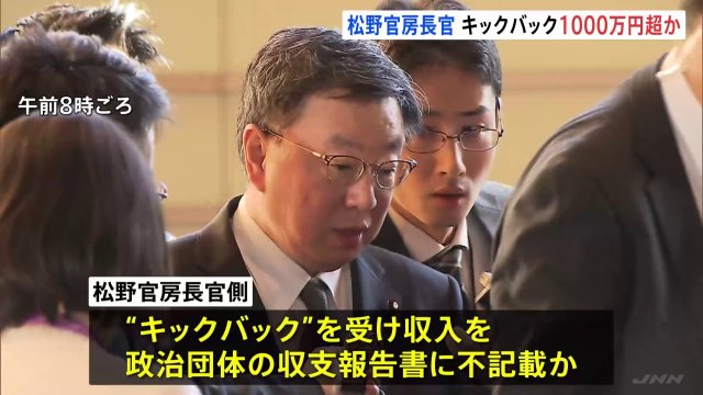 裏金疑惑が政権中枢に及びました。自民党の派閥の政治資金パーティーをめぐる問題で、安倍派の事務総長も務めた松野官房長官側が派閥側からキックバックを受け、1000万円を超える収入を報告書に記載していなかったとみられることがわかりました。