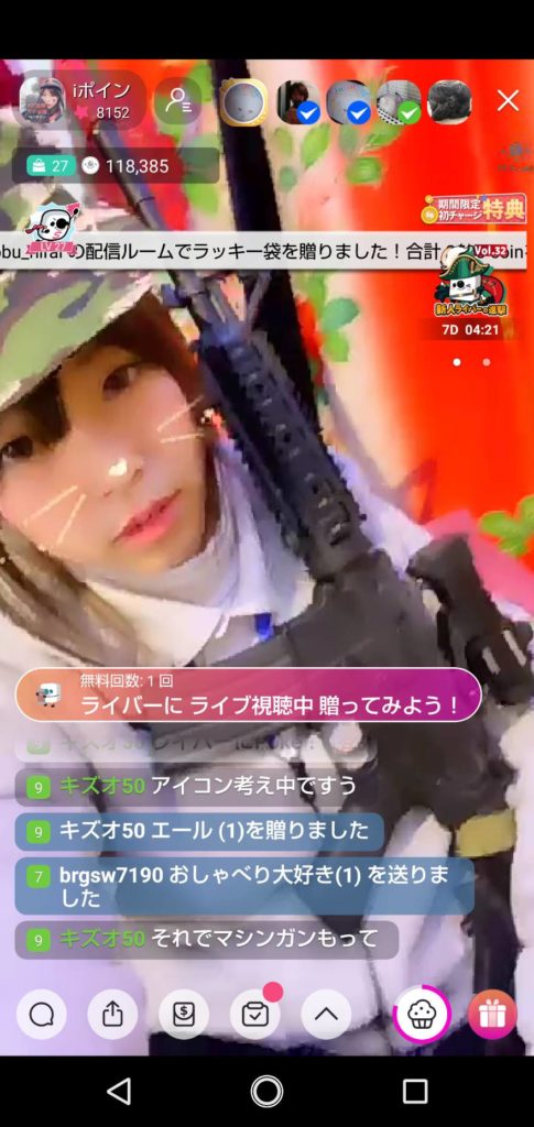 最初はサバイバルゲームの格好で配信、いわゆるサバ女? 夢はどこかの山を買い取ってリスナーと自給自足のサバイバルゲームをしたいらしいです。