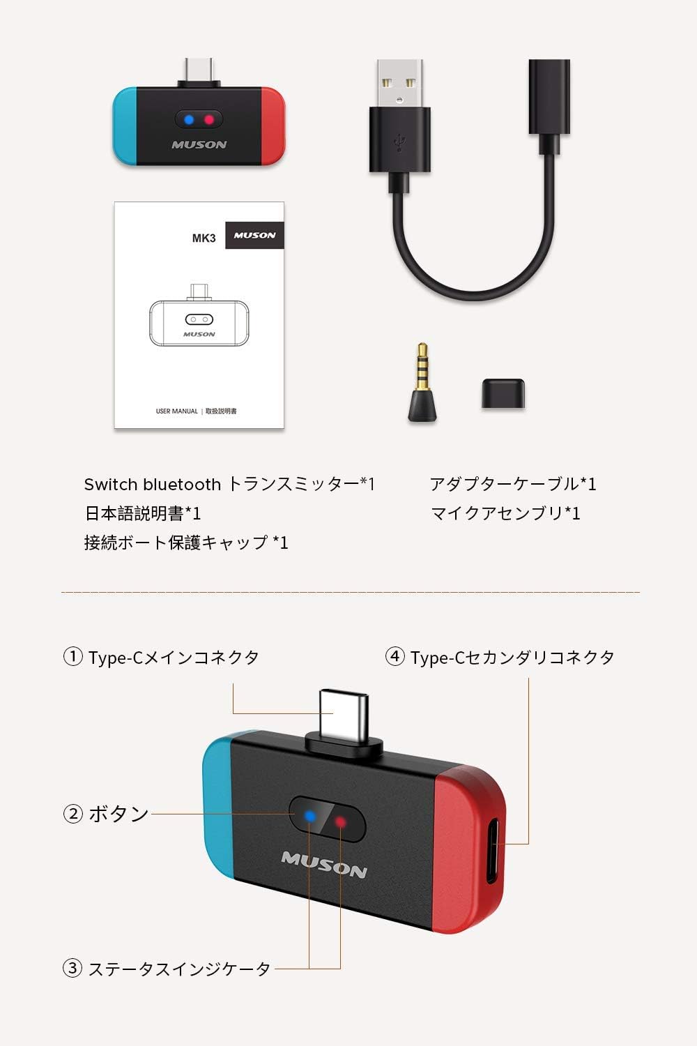 - 「Non-Bluetoothデバイスに対応」MUSON MK3 BluetoothトランスミッターはNintendo Switchに対応するだけではなく、送付したアダプターケーブルによってNon-Bluetooth PC/PS4/他のデバイスをBluetoothレシーバーの機能が得て、イヤホン/ヘッドホン/スピーカーを接続することができます。わずか4秒でペアリング、 縛られることもなく、完全に無線です。