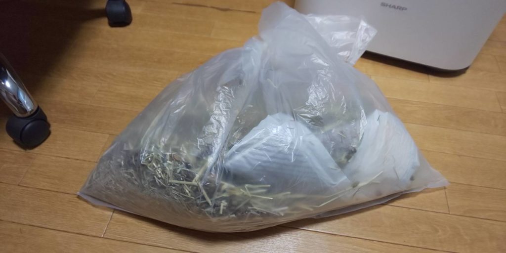 そんな時は上のスノコを少し持ち上げて引くと意外と簡単に抜けます。それにしてもてんこ盛りすぎだぜ。そんな感じで両方のトレイを引き出したら、大きい45Lのゴミ袋へポイッと捨てます。