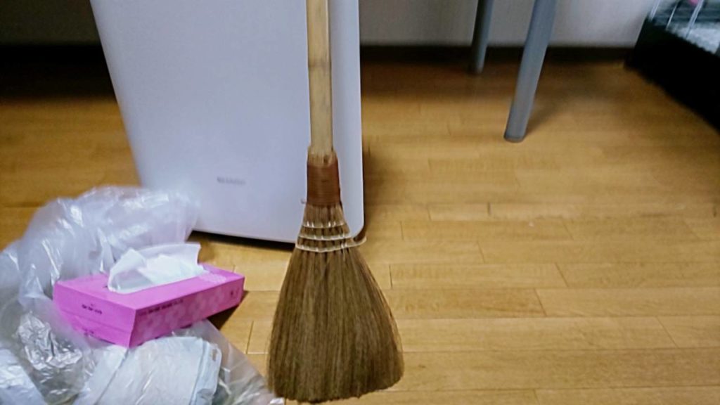 次にスノコの下と下枠の間に挟まったチモシーをホウキでササッと落とします。このホウキ100円均一の何ですがかなり重宝しています!!ちょっと汚いところとか高いホウキを使うなんて嫌じゃないですか、そんな時には使いして感覚の100円ホウキですよ!!