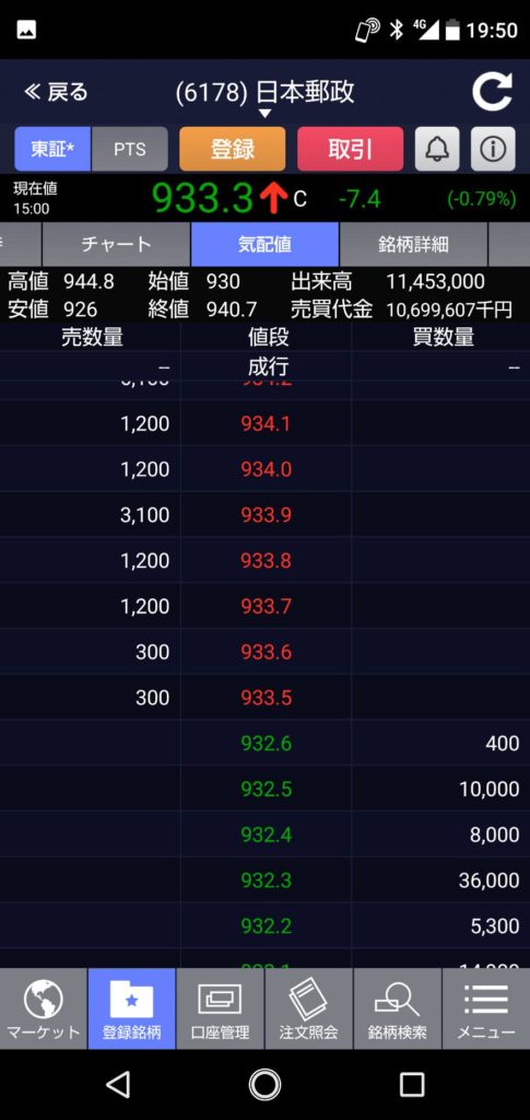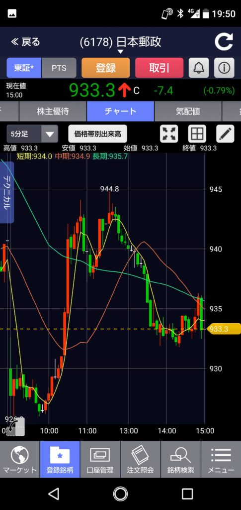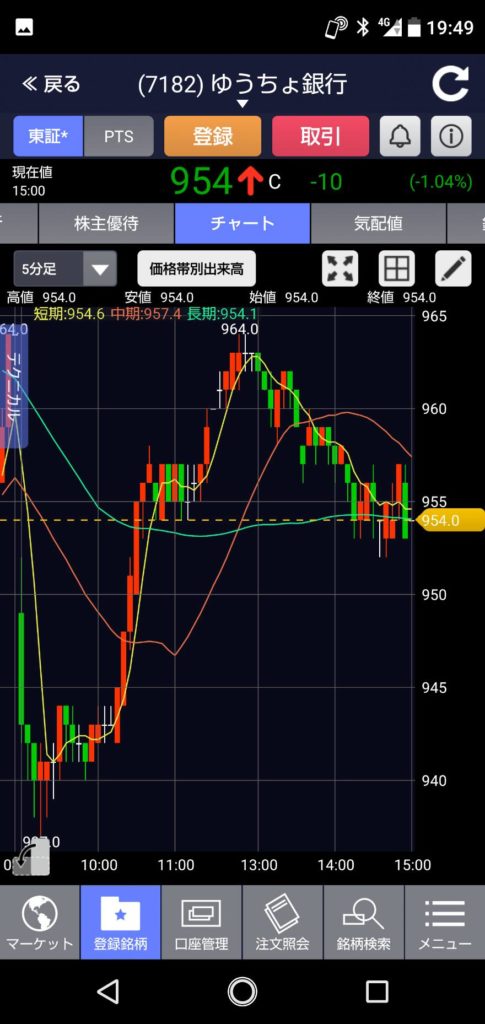 日経平均はプラスだったのに・・・・ゆうちょ銀行も949円で始まってから一気に937円の最安値・・・そこから先週の終値の964円まで上がるものの、本日の終値はー10円の954円で終了。