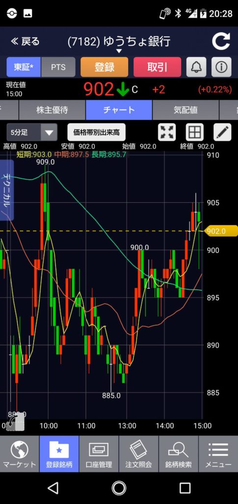 昨日の終値900円より-11円安い、889円でスタート! スタート直ぐに本日の安値883円まで下落しますが、10:00位には本日の最高値909円まで上昇・・・・午前中の終わりごろには885円まで下落。