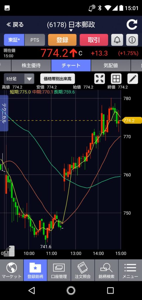 日本郵政もスタートと同時にドンドン下落しましたが、午後一番辺りからドンドン上昇! 最終的には+13円で終わってます。