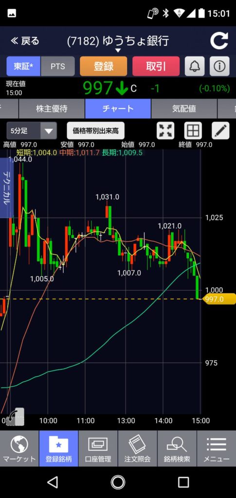 午前中は1,020円くらいで終了。 午後からはまた一気に1,031円まで上がりましたが・・・また1,007円まで下落。 もう一度1,020円まで上がりますが、最終的には前日より-1円安い997円で終わりました。