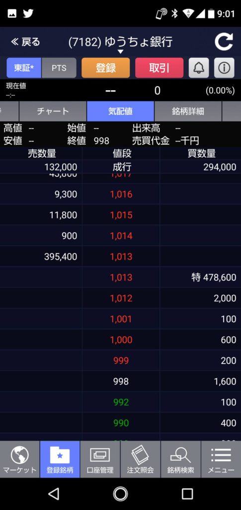 今日のゆうちょ銀行株はすごかった!!先週木曜日の終値より17円高い1,013円でが特別気配?あまり良くわからないけど買いの数が凄かったです。