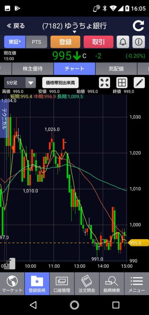 本日の終わり間際1,008円くらいまで上がりますが、前日よりマイナス2円の995で終了。
