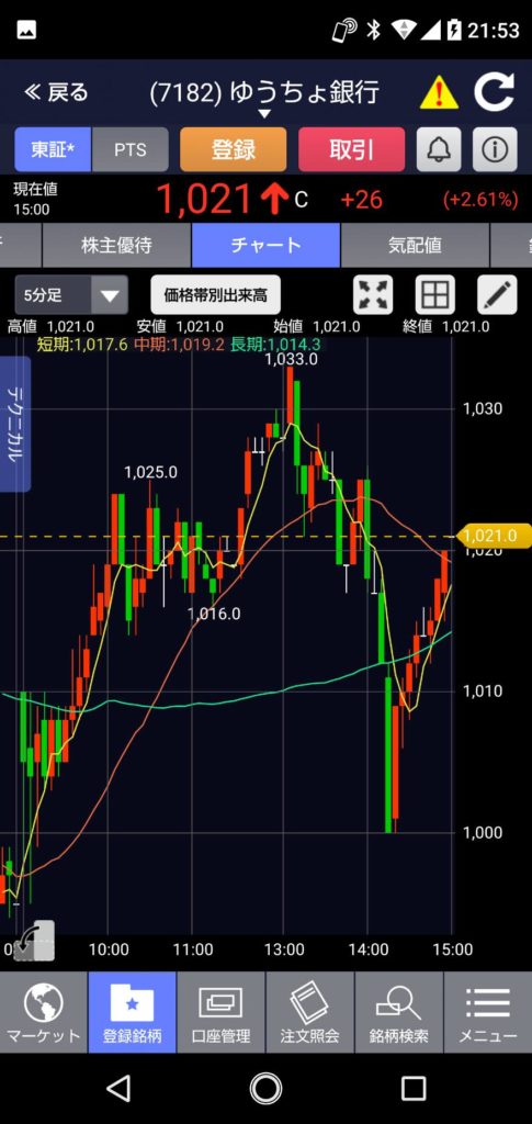 今日のゆうちょ銀行は、前日の995円より+15円高い1,010円でスタート。いきなり995円まで下がりますが、10:00頃には1,025円まで上昇しました。 午前中の終値は1,020円くらいだったような・・・・その後、13:00位には本日の最高値1,033円まで上がりました。
