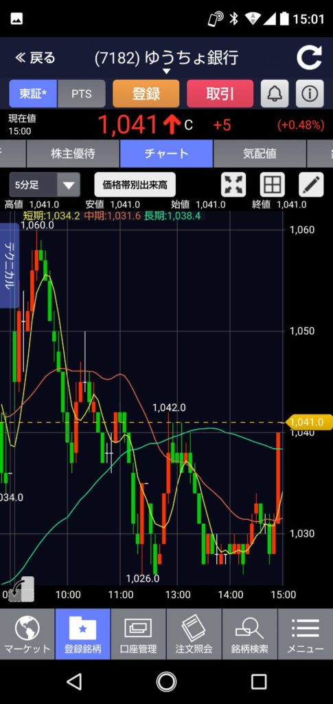 終わり間際に1,030円くらいが一気に1,042円まだ上がって終了でした。