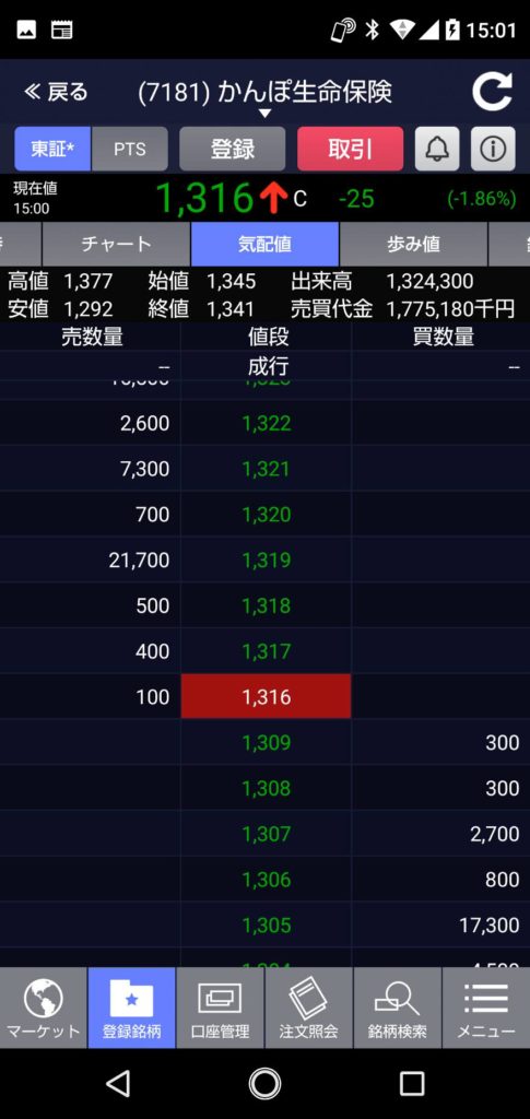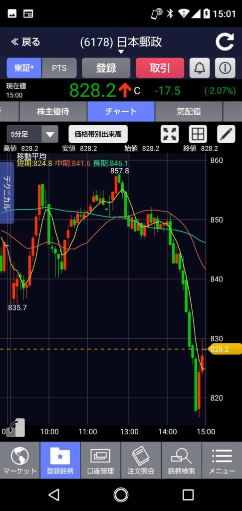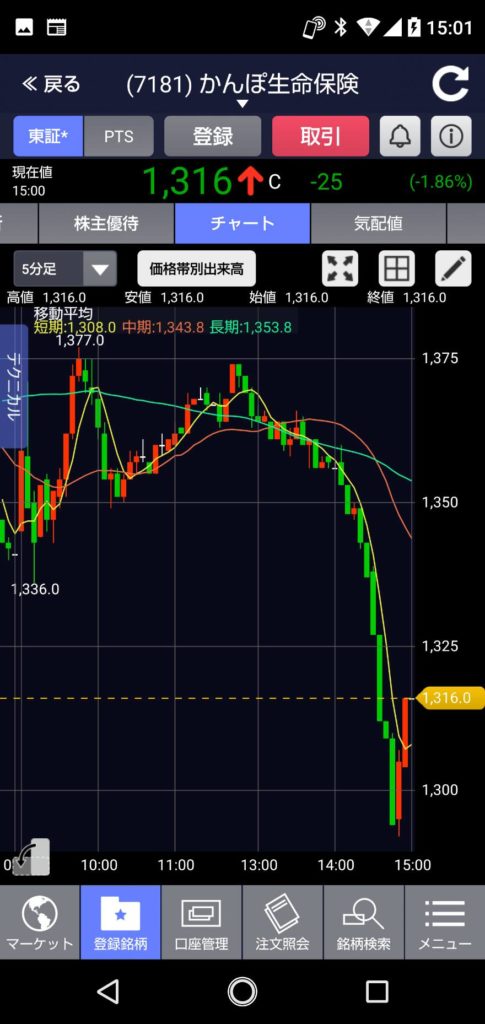 本日のかんぽ生命・日本郵政は午後過ぎまでかなりプラだったのですが、日経平均が14:00過ぎから下がり始めると一気にマイナスになり下落していました。