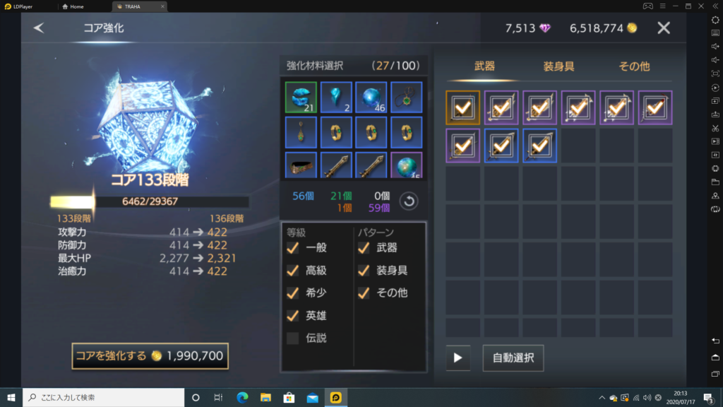 装備も塊も貯まってきたのでコア強化してみたら、133⇒135に上がってしまった。 でもお金メッチャぶっ飛んだけどww