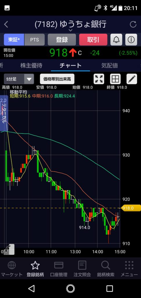 そこからはずっと下がっていきました・・・14:30分くらいには本日最安値の910円まで。