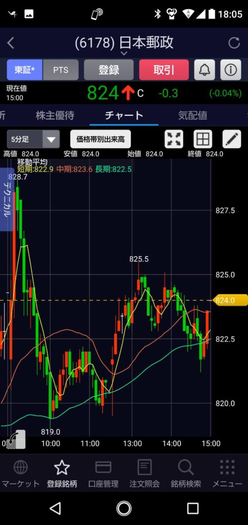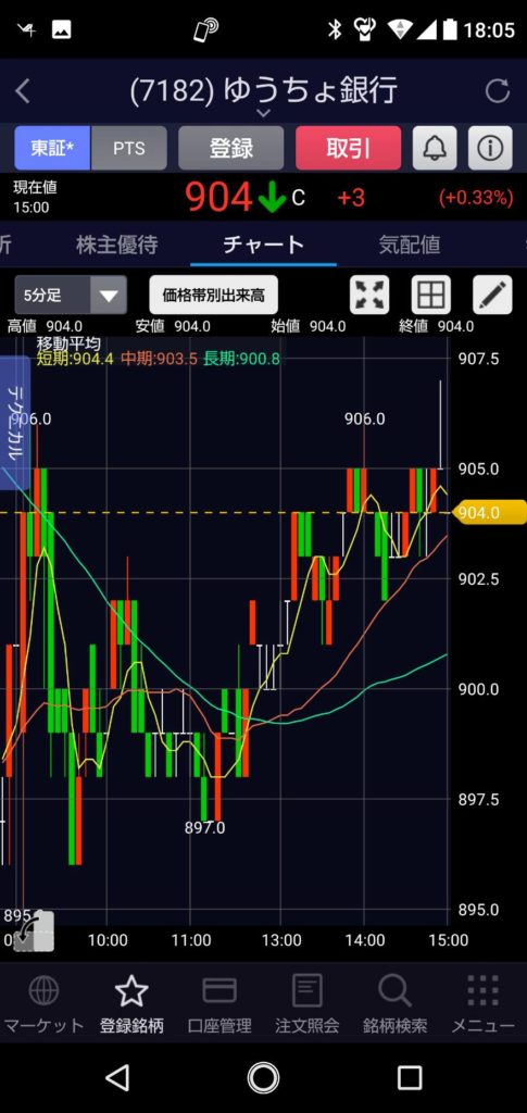 午前中の最後には897円から899円まで下がりますが、午後からは少しづつ上昇して終値904円で終了。