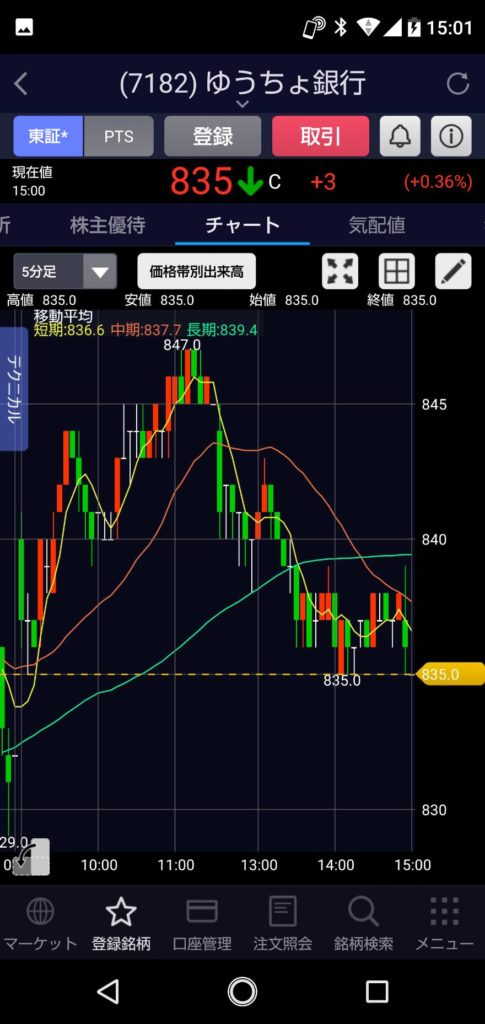 お決まりの直ぐに本日最安値の835円まで下がりますが、午前11:00には最高値の847円まで上昇。