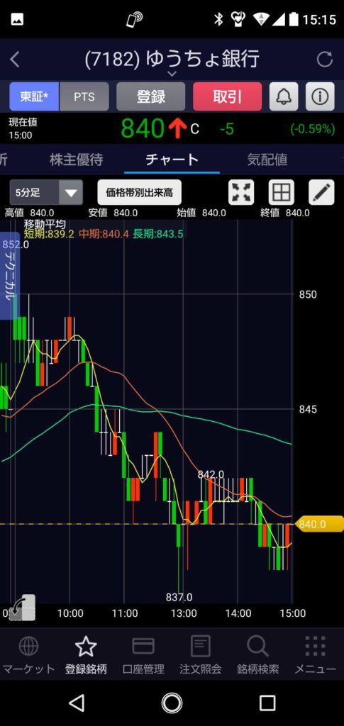 本日のゆうちょ銀行は、先週の金曜日より5円高い850円でスタート。