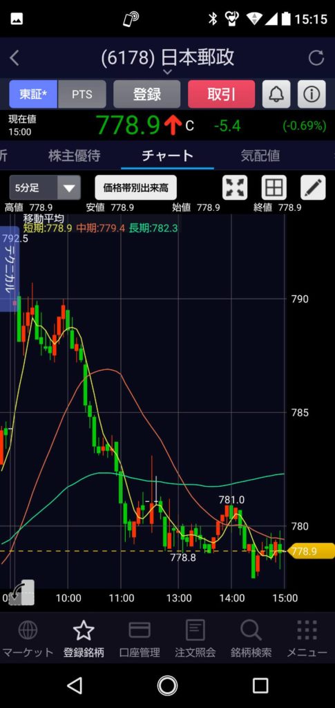 日本郵政も10時くらいから一気に下落、ゆうちょ銀行とおなじようなチャートでした。
