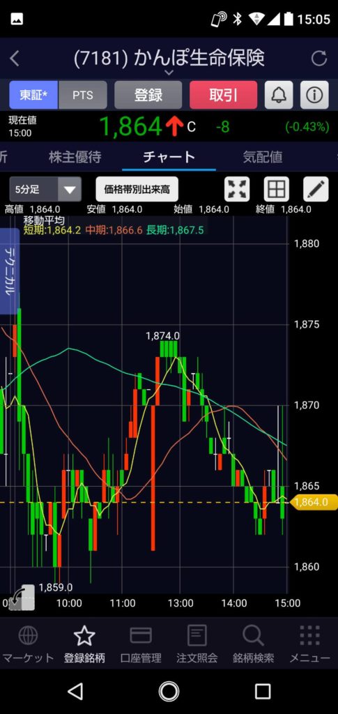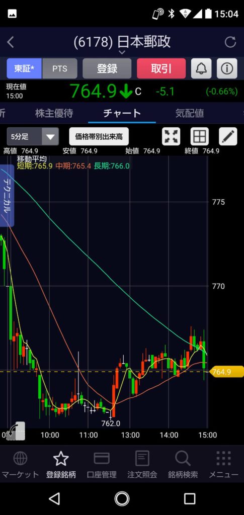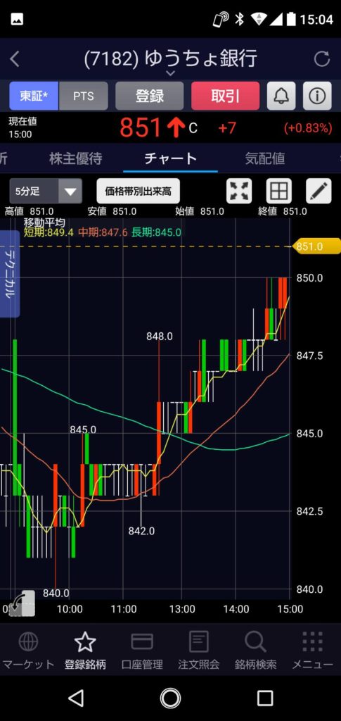 午後からは徐々に上がり始めて、本日最高値の851円で終了。