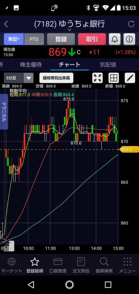 その後はほとんど下がることなく870円前上がり、午後には本日最高値の875円まで上昇しました。