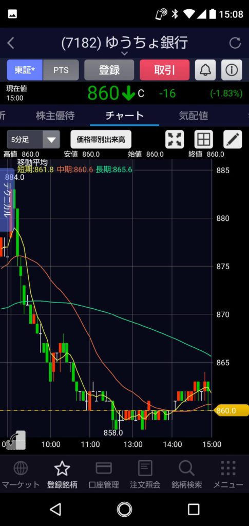 終わり際に864円まで上がるものの最後は一気に下がって860円で終了です。