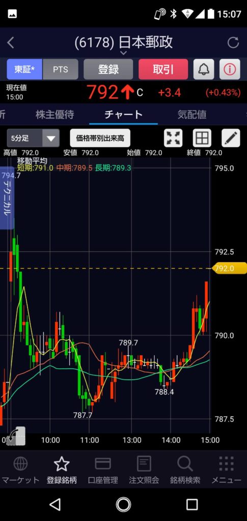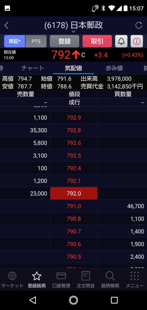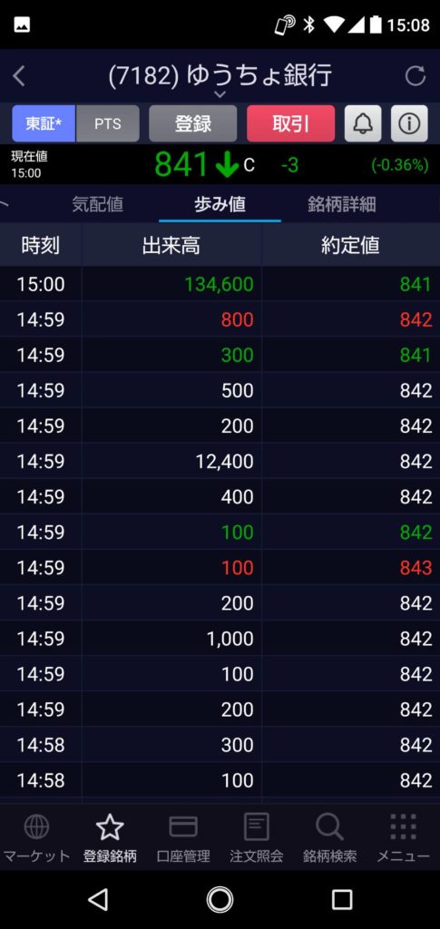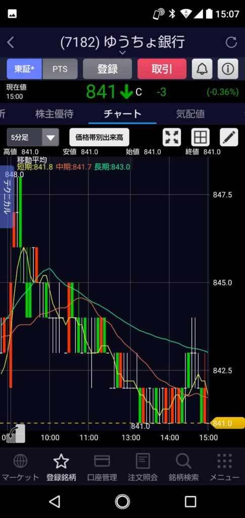午後1時過ぎには最安値の841円まで下がった後15時までに数回841円まで下がっていました。