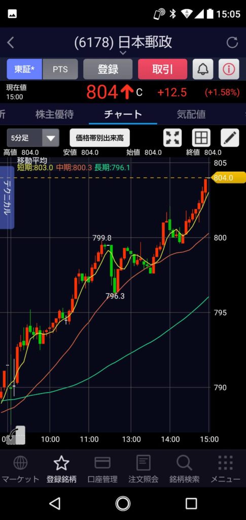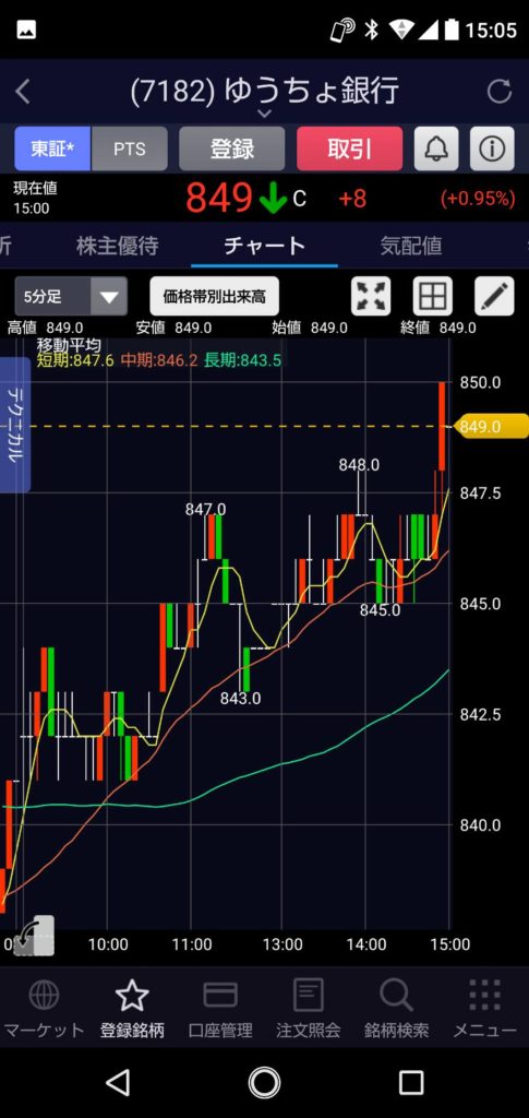 11時頃から少し上がり始めて15:00の終わり間際には850円(本日最高値)まで上がり、849円で終了です。