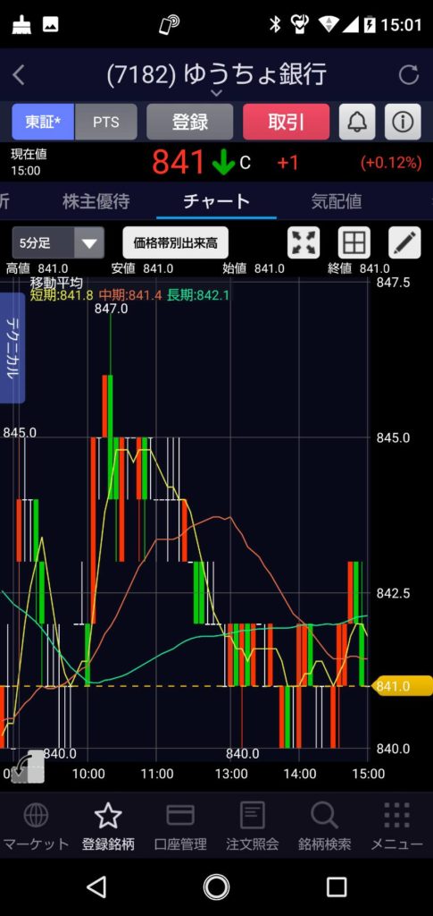 本日のゆうちょ銀行は、前日より3円高い843円でのスタート。 珍しく2回上がったのかな?