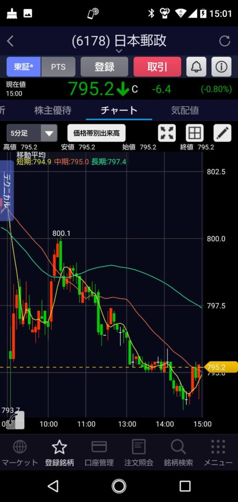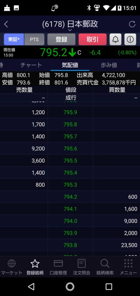 親会社の日本郵政が10時過ぎくらいに800円越えたくらいで後はドンドン下がってくれたので少し安心してみていましたが・・・・
