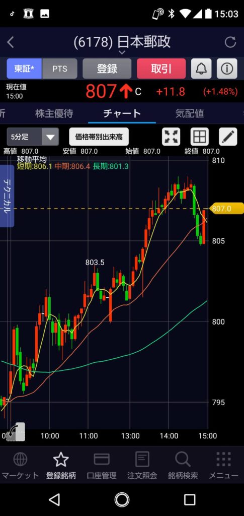 大きく下がることなく14:30過ぎくらいまで上がり続けていましたね。 本日の最高値は870円!