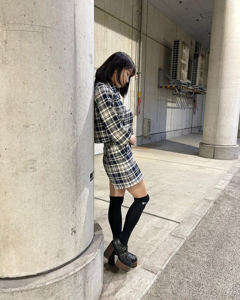 チェック柄のセットアップをまとい、ミニスカートとニーハイソックスの間から“絶対領域”をのぞかせた美脚写真となっている。