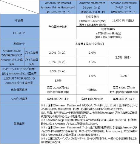 なお、従来のクラシック、ゴールドカードもそのまま利用できるが、サービス内容はリニューアル後の条件となる。ただし、従来のAmazon Mastercard ゴールドを利用者が、引き続きAmazon プライムを利用継続する場合は、新サービスへの移行後も、Amazonでの買い物の付与ポイントが2.5%のままとなる。