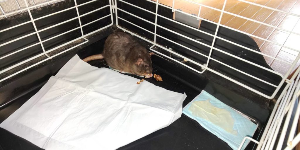 そこでちょっと考えてみた!! オシッコ吸わせたキッチンペーパーは、さすがのラットも引っ張ったりしないでそのまま放置!!