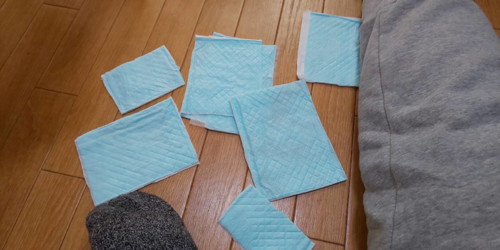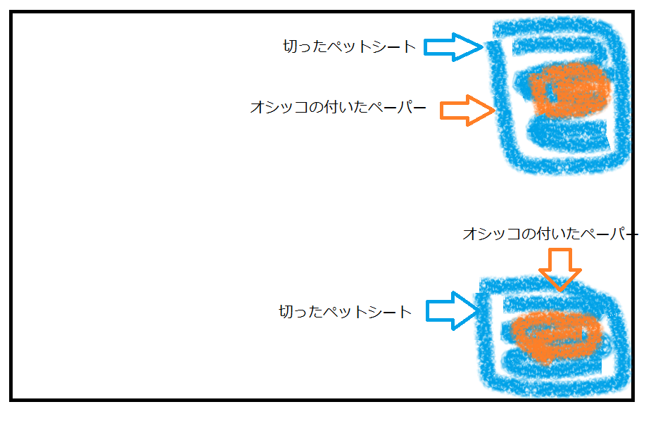 なのでペットシートを適当な大きさに切って、角に置いた後その上にオシッコを吸ったキッチンペーパーを置くことにしてみた!。