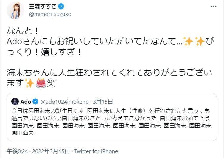 「Adoさんにもお祝いしていただいてたなんて...びっくり!嬉しすぎ!海未ちゃんに人生狂わされてくれてありがとうございます笑」