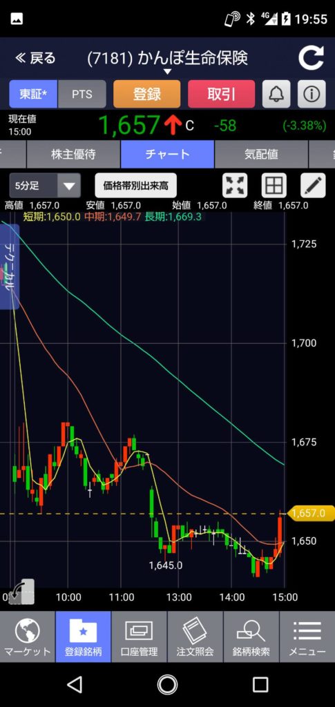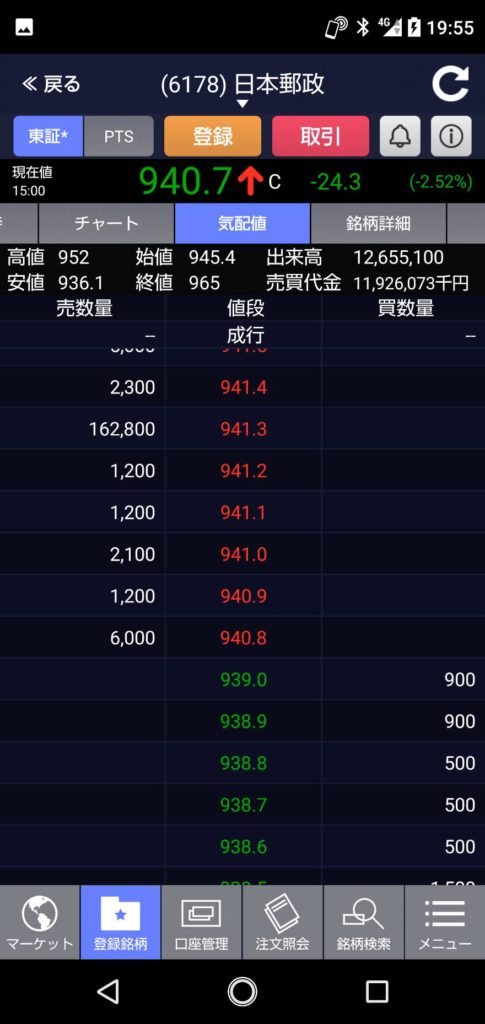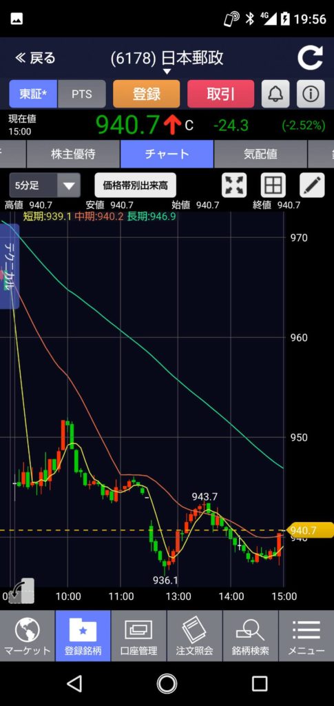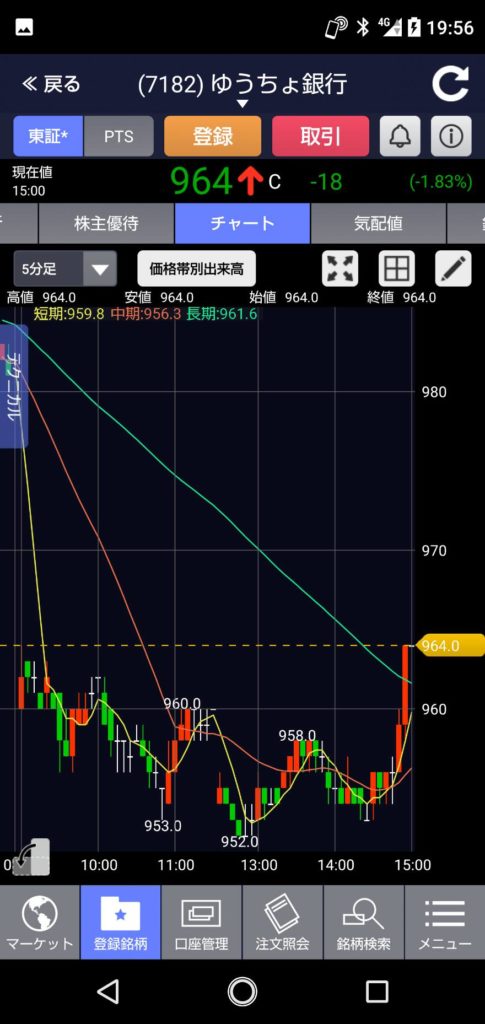ゆうちょ銀行も前日よりマイナス20円の960円スタート、すぐ964円まで上がりますがドンドン下がって本日の安値952円に。