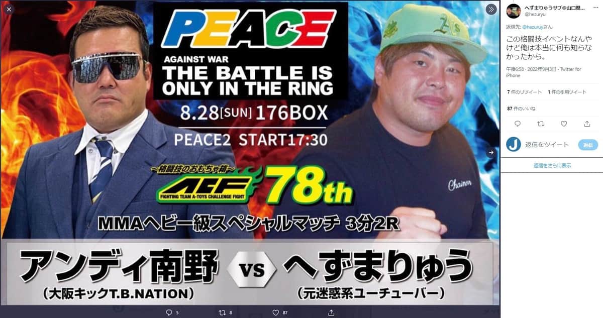 【画像】「アンディ南野VSへずまりゅう」と顔写真付きで載った対戦カード