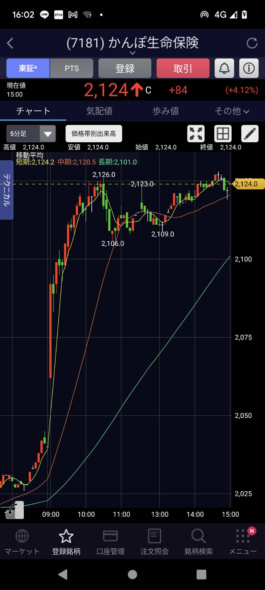 始まってすぐに株価上昇10時過ぎには2126円まで上がった後少し下がりましたが午後からはまた上がって終値2,124円で終了でした。