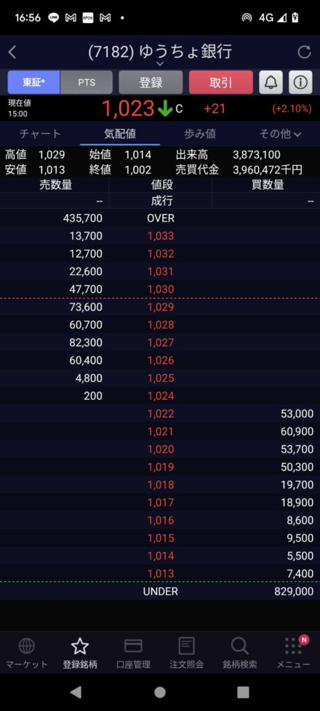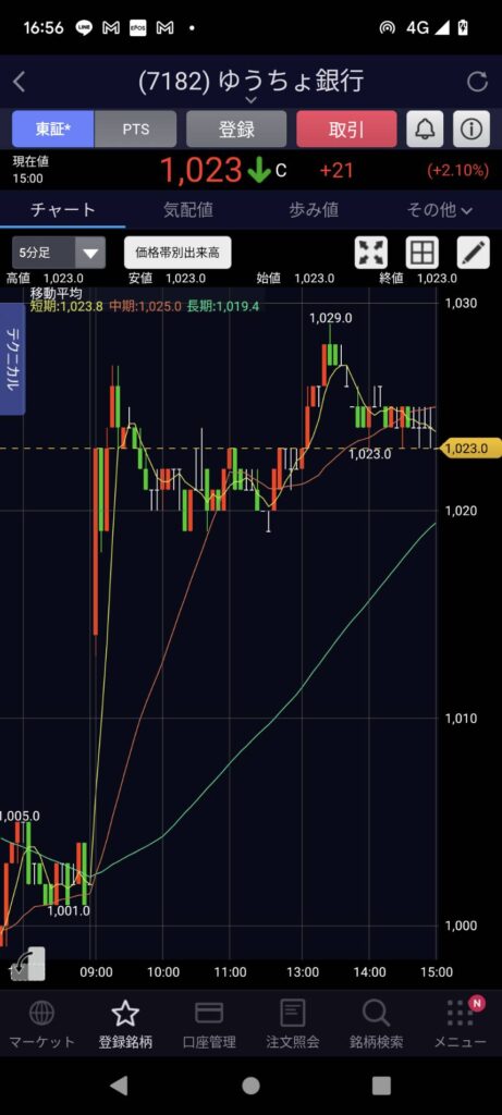ゆうちょ銀行も本日はプラス21円の1,023円で終了。