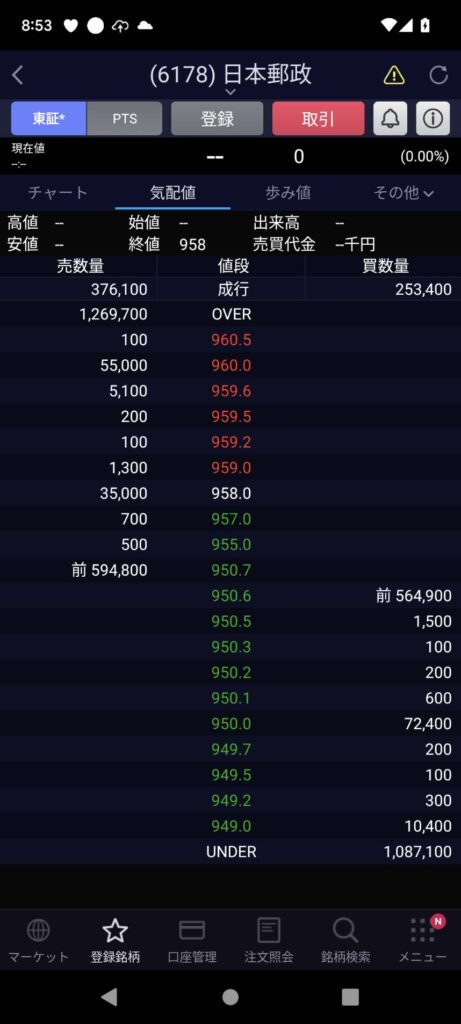 本日の日本郵政・・・前日の終値と同じ958円でスタート