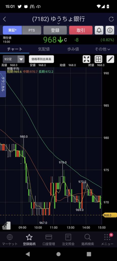 多分9時15分くらいには本日最安値の963.7円まで下落。