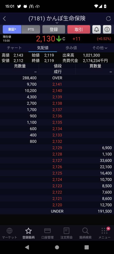今日のかんぽ生命はほとんどプラス圏内だったのかな? 午前の終わり辺りの株価が最高値になってる辺り郵政3社みんな同じだったんですね。