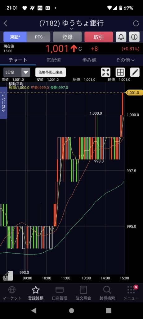 安定の1,002円まで上昇www どうせなら1,000円で空売りしたぜw