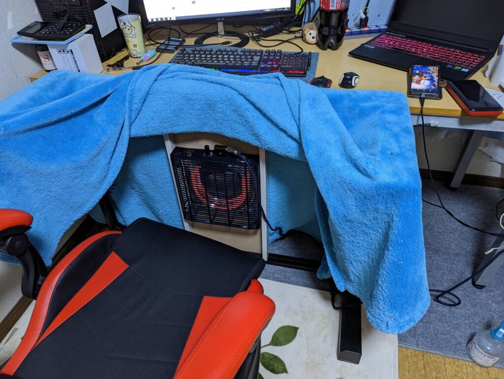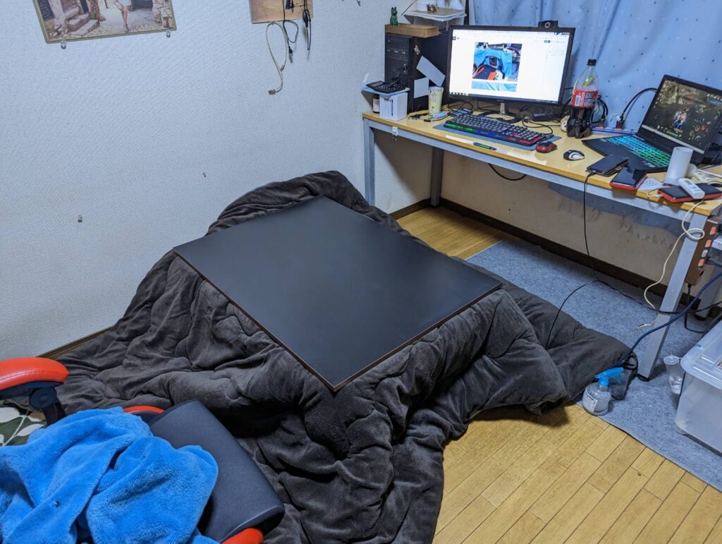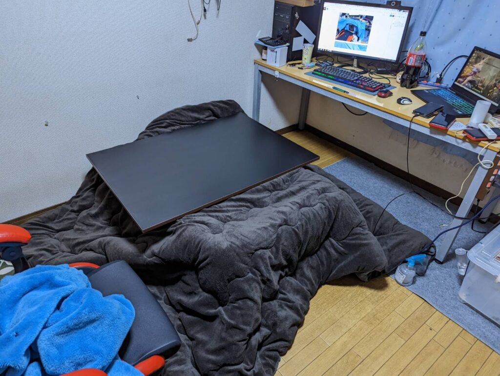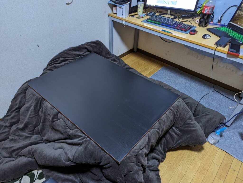 普通コタツって・・・床に置いて使うんだけど・・・・立ててみた!!w コタツに入ってパソコンやってると・・・マジで腰が痛くなるんですよ!! それとすぐ横になって寝てしまうww だけどコタツのぬくぬくを味わいたいと思ったので立て掛けてみました。