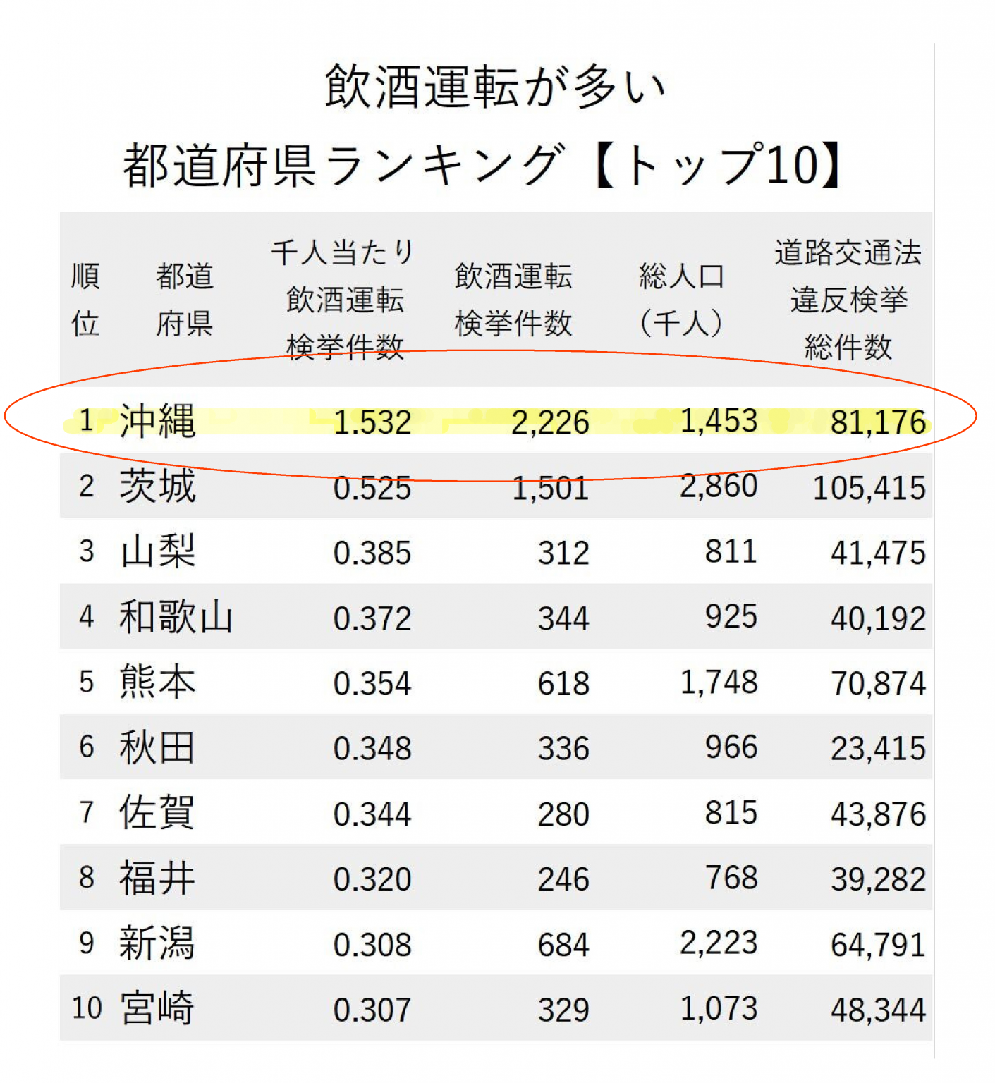 飲酒運転検挙率ワースト1位←2位と3倍の差をつけるぶっちぎり