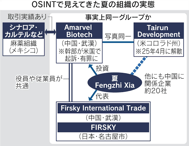 合成麻薬「フェンタニル」を米国に不正輸出する中国組織が日本に拠点をつくっていた疑いが判明した。日本経済新聞の独自調査でわかった。中心人物が名古屋市に法人を登記し、少なくとも2024年7月まで日本から危険薬物の集配送や資金管理を指示していた姿が浮かび上がった。日本は米中対立を招いたフェンタニル危機の最前線となっているおそれがある。