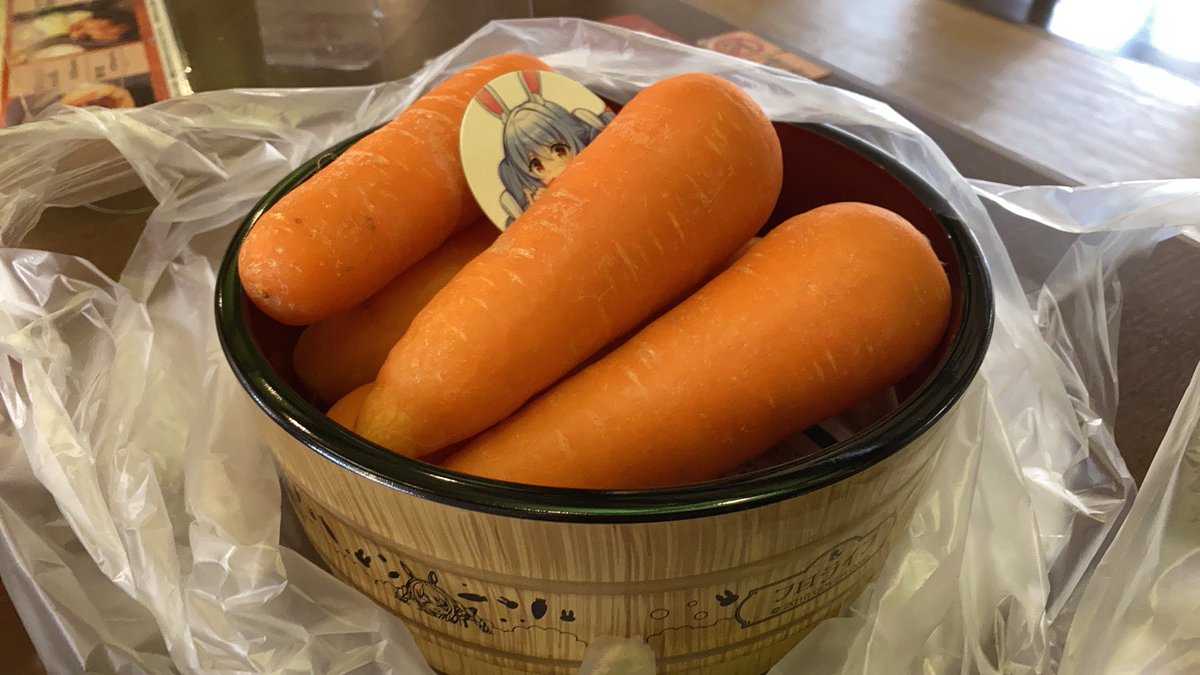 桶人参とは、先日スタートしたスーパー銭湯『極楽湯』と「ホロライブ」のコラボキャンペーンで販売された商品。『ウケ狙いじゃないよっ♡ 桶人参♡』という正式名称で、兎田ぺこらのサインが入った桶と、「人参」がセットになったグッズだ。兎田ぺこらが「にんじんをこよなく愛し、いつでも食べられるように持ち歩いている」という設定のVTuberなので、人参を採用したのだろう。